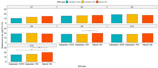 Graphical representation of Streptococcus population on days 1, 2, 3, 6, 9, 12, and 15 postpartum in the cesarean section with seeding (cesarean/WS), cesarean section without seeding (cesarean/WOS), and natural birth (natural/NA). Asterisk (**) and (***): significant differences observed among the groups, with p < 0.01 and p < 0.001, respectively, as determined by the Wilcoxon test.