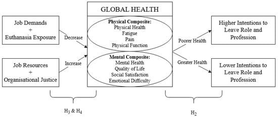 The health of animal care workers in shelters, rescues, and management facilities (e.g., municipal pounds) may be more broadly affected by their work than current literature indicates, as elements of health, such as physical health, have not been explored to the same extent as mental wellbeing, despite evidence suggesting they may be affected. It would be instructive to examine wider health factors in these animal care workers and explore contributing factors using the JD-R, including the role of OJ. As such, this study aimed to explore global health among those working in animal management, sheltering, and rescue, as well as to assess whether this is associated with turnover from work, job demands and resources, and OJ. First, it was hypothesised that participants would self-report lower than average physical and mental health (H1). Second, self-reported health would be inversely correlated with turnover intention (H2). Third, higher job demands would predict poorer self-reported health, whilst higher resources would predict greater health (H3). Fourth, higher OJ perception would predict greater health (H4). The explored relationships are shown in Figure 1.