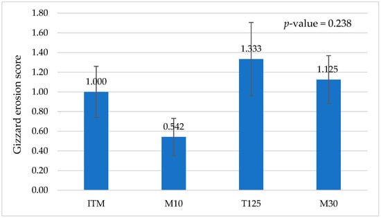 Thigh and drumstick weights were higher in birds fed the M30 diet compared to birds fed the ITM control diet at day 42 (p = 0.050, Table 6). However, the weights of breast, fat pad, liver, heart, and kidney were not different between the dietary treatments. Breast blister and skin scratches were not observed on sampled birds at day 42. Similarly, gizzard erosion score was not different between the dietary treatments at day 42 (Figure 1). The percentage yield values (%) of all carcass parts, fat pad, liver, heart, and kidney were not significantly different between the dietary treatments (p-value > 0.05); thus, the data were not presented in this paper.