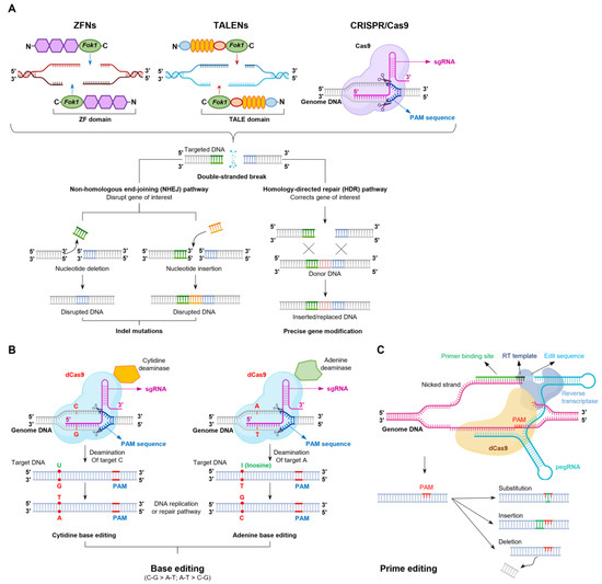 - Anzalone, A.V.; Randolph, P.B.; Davis, J.R.; Sousa, A.A.; Koblan, L.W.; Levy, J.M.; Chen, P.J.; Wilson, C.; Newby, G.A.; Raguram, A.; et al. Search-and-replace genome editing without double-strand breaks or donor DNA. Nature 2019, 576, 149–157. [Google Scholar] [CrossRef] [PubMed]