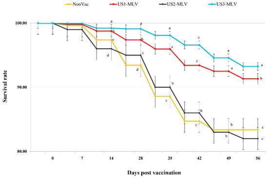 The survival rates in three different PRRSV MLV-vaccinated groups, US1-MLV, US2-MLV, and US3-MLV groups vaccinated with Ingelvac PRRS® MLV, HP-PRRSV-based vaccine and Prime Pac PRRS® MLV, respectively, compared to the non-vaccinated group (NonVac). Variation is expressed as the standard deviation. Different letters in superscript indicate a statistically significant difference (p-value < 0.01) between groups.