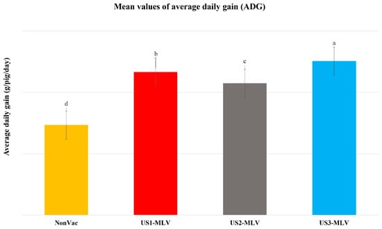 The mean average daily gain (ADG) of four treatment groups (NonVac, US1-MLV, US2-MLV, and US3-MLV) and ADG values are expressed as mean ± standard error of the mean (SEM). Different letters in superscript indicate statistical significant difference (p-value < 0.01) between treatment groups.