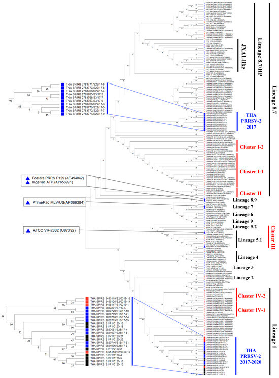 Neighbor-joining tree of PRRSV-2 isolates based on the nucleotide sequences of complete ORF5 genes. Filled triangles represent PRRSV-2 prototype virus (VR-2332) and PRRSV-2 modified live vaccines. The rest of the filled squares represent new Thai PRRSV-2 clusters. The color of filled squares indicates the year of isolation. Blue, red, and black indicate isolation in 2017, 2019, and 2020, respectively.