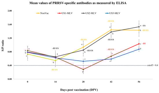 Mean values of PRRSV-specific antibodies as measured by ELISA of four treatment groups, Non-Vac, US1-MLV, US2-MLV, and US3-MLV. Antibody titers are shown as mean ± standard error of the mean (SEM). Different letters within the same DPV indicate statistically significant differences between groups (p-value < 0.01). A dashed line indicates the cutoff level (S/P ratio of 0.4). All serum samples collected at 0 day post-vaccination (DPV) were PRRSV ELISA-positive and PCR-negative. Pigs in the US3-MLV group remained ELISA-positive and PCR-negative throughout the study. EU and US indicated positive RNA detection in serum samples by RT-PCR at each DPV.