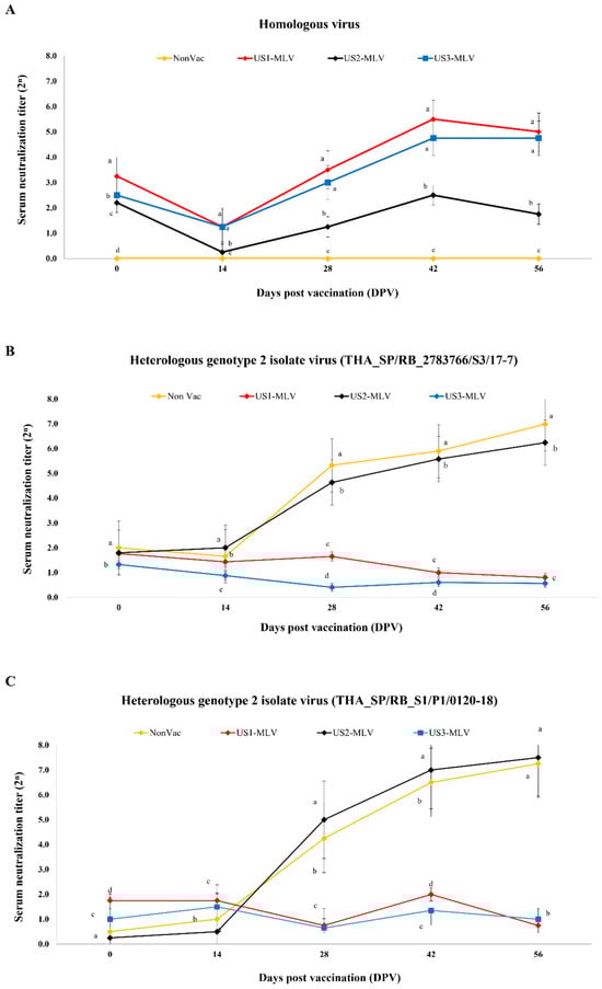 Antibody response measured by the serum neutralizing (SN) assay across four groups: NonVac, US1-MLV, US2-MLV, and US3-MLV. The SN assay was conducted using three different types of viruses: homologous virus (A), heterologous PRRSV-2 isolate THA_SP/RB_2783766/S3/17-7 (B), and heterologous PRRSV-2 isolate THA_SP/RB_S1/P1/0120-18 (C). The SN values are shown as mean ± standard error of the mean (SEM). Different letters within the same DPV indicate statistically significant differences between groups (p-value < 0.01).