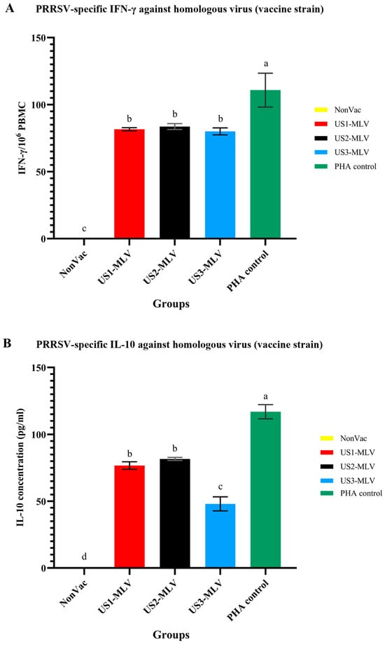 Similarly, supernatants from PBMCs stimulated with the homologous virus (vaccine strain) showed the highest IL-10 levels in the US2-MLV group, significantly exceeding those in the other groups, followed by the US1-MLV group (Figure 6B). The US3-MLV group had the significantly lowest IL-10 level. However, the IL-10 levels were not significantly different between the US1-MLV and US2-MLV groups.