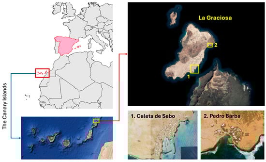 The location of La Graciosa within the Canary Islands (red square in the upper left panel) and its primary settlements. La Graciosa (yellow square in the lower left panel), part of the Natura 2000 network, is situated north of Lanzarote in the Canary Islands. The island’s main settlements, Caleta de Sebo (1) and Pedro Barba (2), are highlighted (yellow squares in the upper right panel). Caleta de Sebo serves as the primary residential and administrative center, while Pedro Barba functions as a smaller residential area. Both human settlements also belong to the Natura 2000 protected area.