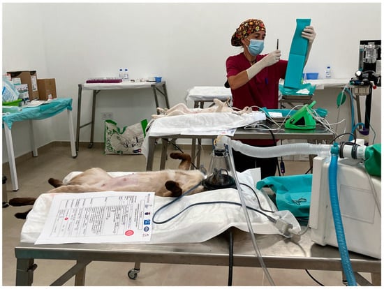 A temporary veterinary facility was established at the sociocultural center in Caleta de Sebo, organized into areas for reception, pre-surgical examination, surgery, and post-operative care. To implement a high-volume, high-quality spay–neuter approach, the surgical area was specifically organized and equipped with essential veterinary surgical equipment to ensure high standards of animal care [] (Figure 2).