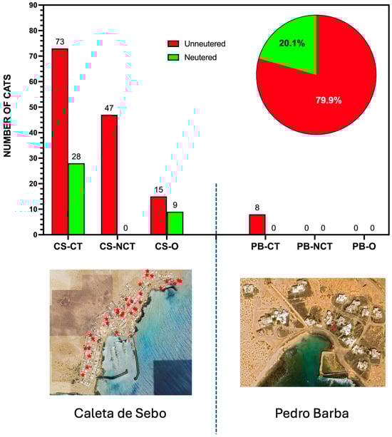 In Caleta de Sebo, the proportion of unneutered cats was notably higher than that of neutered ones, as depicted in Figure 3. Among the unowned cats, most fell into the community-tended groups (CS-CT), where 73 individuals were unneutered compared to 28 that were sterilized. The non-community-tended group (CS-NCT) included 47 unneutered cats with no sterilized individuals recorded. Owned cats (CS-O) displayed a more balanced distribution, with 15 unneutered and 9 neutered cats. In Pedro Barba, the entire identified population of 8 unowned cats was unneutered, emphasizing the lack of intervention in this smaller settlement. The overall data depicted in Figure 3 clearly demonstrate that unneutered cats represented the majority across both urban areas, highlighting the need for targeted management strategies.