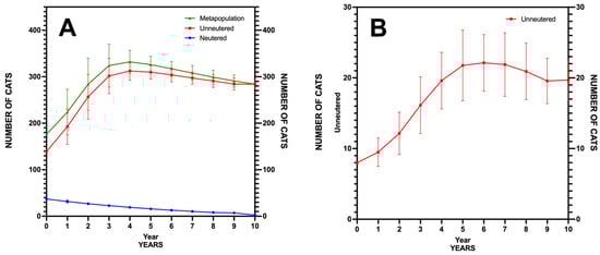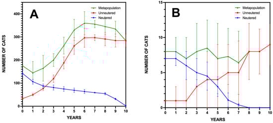 Projected population dynamics for community cats in Caleta de Sebo (A) and Pedro Barba (B) on La Graciosa based on Population Viability Analysis (PVA) simulations over 10-year period.