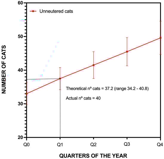 By the conclusion of the study, there was a net increase of seven cats over the three-month period. With the impending births from the two pregnant females, an additional five to seven kittens were anticipated, potentially further increasing the population. To contextualize this short-term increase, we compared the observed growth rate with the projections of the Population Viability Analysis (PVA) model. Figure 7 illustrates how the actual population increase aligns with modeled expectations over the same period, providing a direct comparison of real and predicted population trends.