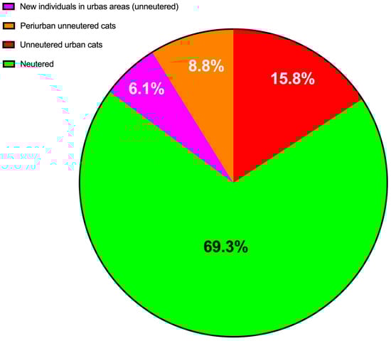 Globally, the intervention significantly shifted the proportion of sterilized versus unsterilized cats. As illustrated in the inset of Figure 5, 81.4% of the cat population was sterilized following the campaign, with only 18.6% remaining unsterilized. This shift highlights the substantial impact of the campaign in altering the reproductive potential of the population in a short period.