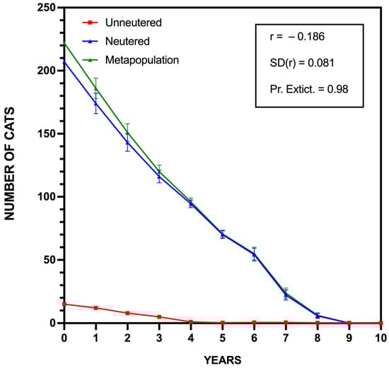 Finally, we performed a theoretical additional PVA, assuming that the second phase was completed and had yielded the targeted 93% sterilization data (initial population = 222 cats; 207 unowned and 15 owned with outdoor access, according to our updated census) and that annual maintenance is performed by the municipality. In the model, we assumed that this maintenance consists of six newborn cats from the pool of unneutered cats are either sterilized or given in adoption annually (from years 1 to 4), and that seven cats (either sterilized or not) were trapped and relocated out of La Graciosa due to proven high predation rates of these individuals as permitted by law 7/2023. Since La Graciosa’s cat population is isolated, as in previous PVA models, we assume no immigration and no abandonment of new cats.