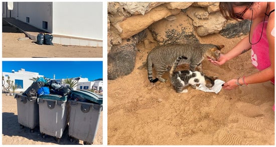 For instance, Mameno et al. [] documented public attitudes toward cat management on Amami Oshima Island, Japan, where there was high acceptance of TNR and adoption but significant resistance to lethal control—particularly among cat owners due to cultural and social values. Similarly, the case of La Palma, also in the Canary Islands, highlights how residents’ perceptions of cats as both pest controllers and companions add another layer of complexity to management efforts []. Additionally, a systematic review of cat management practices in remote Indigenous communities in Australia suggests that culturally appropriate, multi-method approaches that combine TNR with education and community involvement yield the most sustainable results, especially in areas with strong social ties to community cats’ populations []. On La Graciosa, for example, prohibiting feeding practices was deemed counterproductive, as it could drive cats to expand their ranges into adjacent natural areas in search of prey, exacerbating the ecological impact. Instead, we propose managed feeding with balanced diets rich in animal protein, which research has shown to reduce predation rates and align with conservation priorities, as proposed by other authors []. A key factor influencing cat population dynamics in La Graciosa is the abundance of anthropogenic food sources, which range from unsecured garbage bags to direct feeding by tourists and caretakers (Figure 10). This availability of food complicates management strategies, as it sustains the population regardless of formal feeding bans, reinforcing the argument that prohibiting feeding alone would not be an effective measure for population control or mitigating ecological impact.