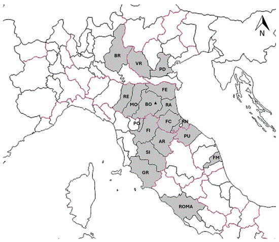 Italian provinces of origin of the horses included in the study. Outlined in purple = Italian regions; outlined in black = Italian provinces; highlighted in grey = Italian provinces of origin of the horses included in the study. AR = Arezzo; BO = Bologna; BR = Brescia; FC = Forlì-Cesena; FE = Ferrara; FI = Firenze; FM = Fermo; GR = Grosseto; MO = Modena; PD = Padova; PO = Prato; PU = Pesaro–Urbino; RA = Ravenna; RE = Reggio Emilia; RN = Rimini; ROMA = Roma; SI = Siena; VR = Verona. ▲ = location of the VTH.
