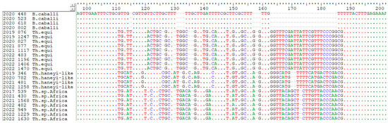 Sequence analysis of the 18S rRNA gene, on a fragment of about 580 bp for Babesia spp. and 680 bp for Theileria spp., revealed that the four horses that tested positive for Babesia spp. were infected by B. caballi (4/63, 6.4%) and the sequences obtained were identical to each other. On the other hand, the 22 horses that tested positive for Theileria spp. were infected by piroplasms belonging to three distinct genetic groups: (i) nine horses (9/63, 14.3%) were infected with T. equi; (ii) six horses (6/63, 9.5%) were infected with piroplasms displaying nucleotide profiles compatible with some T. haneyi previously reported in China (GenBank ID: ON429000, ON429018, ON429006) and some T. equi (GenBank ID: AY534882, DQ287951), hereinafter referred to as T. haneyi-like; and (iii) seven horses (7/63, 11.1%) were infected with piroplasms that exhibited numerous unique and shared nucleotide mutations, showing significant similarities to sequences deposited in GenBank as Theileria sp. Africa, a novel candidate species that has not yet been classified. Two horses (2/63, 3.2%) were co-infected with B. caballi and T. haneyi-like.