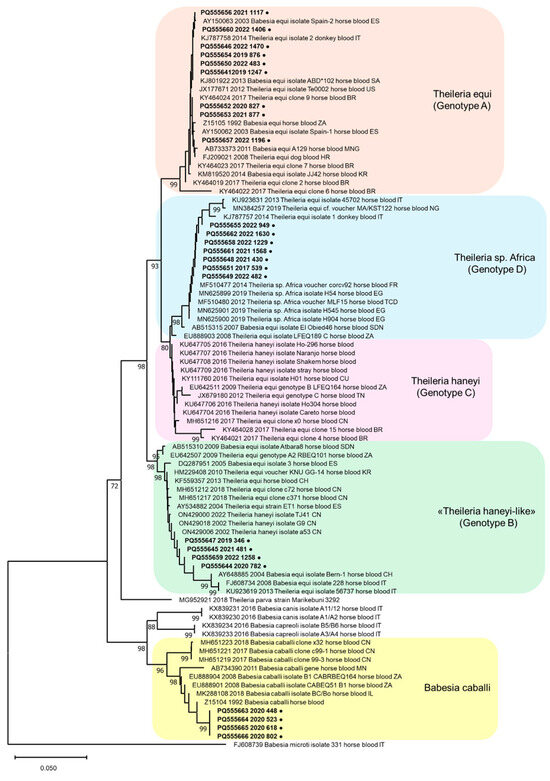Phylogenetic tree constructed using the Neighbor-Joining method and the Kimura 2-parameter model implemented in MEGA 11 software version 11.0.11, based on the nucleotide alignment of 727 residues of the 18S rRNA gene of Babesia spp. and Theileria spp. sequences obtained in this study by sequencing the nested PCR products, with 14 reference sequences of Babesia spp. and 49 reference sequences of Theileria spp. available in GenBank (https://www.ncbi.nlm.nih.gov/nucleotide/ (accessed on 15 November 2024)). Bootstrap values calculated from 1000 replicates are indicated on the respective branches. The reference sequences are labeled as follows: GenBank number, date of collection (or submission date), genus, species, host, sample matrix, country of origin (BR = Brazil, CH = Switzerland, CN = China, CU = Cuba, ES = Spain, EG = Egypt, FR = France, HR = Croatia, IL = Israel, IT = Italy, KR = South Korea, MN = MNG = Mongolia, NG = Nigeria, SA = Saudi Arabia, SDN = Sudan, TCD = Chad, TN = Tunisia, US = United States, ZA = South Africa) ● = sequences obtained in this study labeled with GenBank number (PQ555641-PQ555666), year of collection and sample ID. The main species of piroplasms and (the corresponding genotype proposed for Theileria genus by Nehra and colleagues [15]) characterizing the clusters are reported alongside the tree.