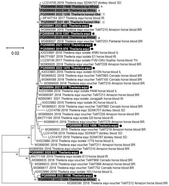 Phylogenetic tree constructed using the Neighbor-Joining method and the Kimura 2-parameter model implemented in MEGA 11 software version 11.0.11, based on the nucleotide alignment of 207 residues of the ema1 gene of Theileria spp. sequences obtained in this study with 33 reference sequences of Theileria spp. available in GenBank (https://www.ncbi.nlm.nih.gov/nucleotide/ (accessed on 15 November 2024)). Bootstrap values calculated from 1000 replicates are indicated on the respective branches. The reference sequences are labeled as follows: GenBank number, date of collection (or submission date), genus, species, host, sample matrix, country of origin (BR = Brazil, IL = Israel, IR = Iran, IT = Italy, SD = Sudan). Highlighted and marked sequences obtained in this study: with black ● for T. equi, with dark grey ▲ for Theileria sp. Africa, and with light grey ■ for T. haneyi-like, labeled as follows: GenBank Number (PQ558986-PQ559000), year of collection, sample ID, and 18S rRNA identification.