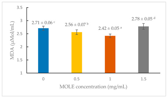 Effects of MOLE concentrations on lipid peroxidation of frozen–thawed semen. Values with different superscript letters (a, b, c, d) indicate significant differences between MOLE concentrations (p < 0.05).