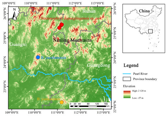 Distribution map of Boulenophrys dupanglingensis sp. nov. and the type localities of two phylogenetically close species.
