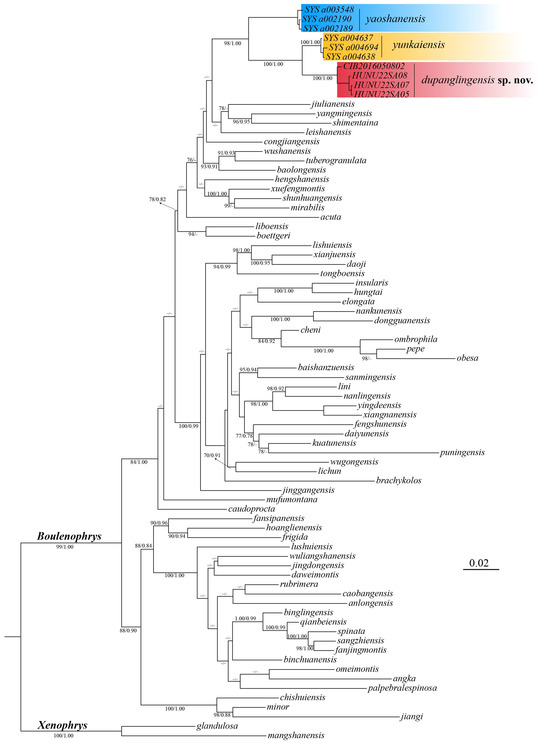For the phylogenetic analyses, sequences were obtained from GenBank, including 68 known Boulenophrys species (except B.shuichengensis, for which no sequence information is available) and 2 outgroup species (Xenophrys glandulosa and X. mangshanensis) (Table S2). All sequences were aligned using the Clustal W algorithm with default parameters [17] and then trimmed using the partial gap deletion option in MEGA 11 [18]. Gaps in highly variable regions were removed. The best-fit evolutionary model (GTR+G+I) was determined using PartitionFinder v. 2.1.1 based on the AIC criterion [19]. Phylogenetic analyses were conducted using Bayesian inference (BI) with MrBayes 3.2 [20], and maximum likelihood (ML) trees were generated using PhyML v. 3.0 [21]. The BI analysis ran for 20,000,000 generations, with samples taken every 1000 generations, discarding the first 25% as burn-in, resulting in a potential scale reduction factor (PSRF) of <0.005. For the ML analysis, a bootstrap consensus tree was created from 1000 replicates.