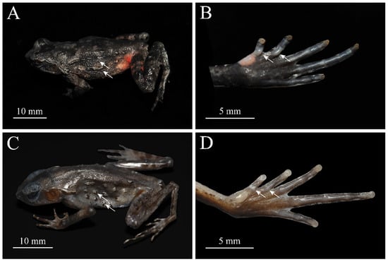Comparisons of Boulenophrys dupanglingensis sp. nov. (CIB2016050802) and B. yunkaiensis (SYS a004986) in preservative. White arrows indicate differences between closely related congeners. Boulenophrys dupanglingensis sp. nov.: (A) dorsolateral view; (B) plantar view of foot. B. yunkaiensis: (C) dorsolateral view; (D) plantar view of foot. Photo by Shengchao Shi (A,B) and Le-Qiang Zhu (C,D).