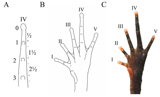 Description of webbing formula according to Savage and Heyer (1997). (A) Pattern of the fourth toes finger, with phalangeal joint used as the measurement; (B) pattern of the ventral foot in B. dupanglingensis sp. nov.; (C) photograph of the ventral foot. Photo by Jia-Yan Xi.