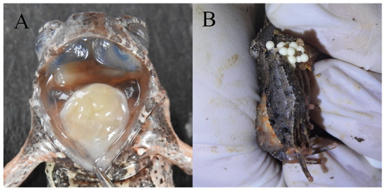 (A) Edge of the tongue; (B) eggs of living paratype. Photo by Jia-Yan Xi.
