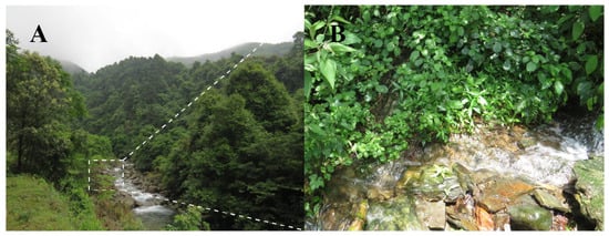 Habitat of Boulenophrys dupanglingensis sp. nov.(A) Landscape of montane forests at the type locality. (B) microhabitats of the new species, mountain stream (white box shown in the Fig 8A). Photo by Sheng-Chao Shi.