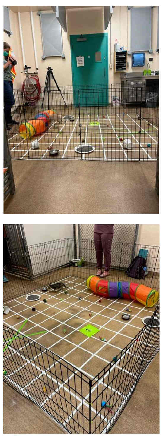 All behavioural tests took place in the same test arena (2.44 × 2.44 m, divided into n = 100 0.24 m grids, with the walls of the arena defined by 92 cm high “X-pen” panels; see photos Figure 1). Behavioural assessments were conducted in the same sequence for all kittens over each of the three sessions (i.e., 8, 10, and 12 weeks of age). The arena and all toys and bowls used during testing were cleaned/disinfected between each litter tested. The floor and the toys were cleaned/disinfected with Prevail®, and food and water bowls were thoroughly cleaned with commercial dish detergent. All behavioural testing was video-recorded for subsequent scoring.