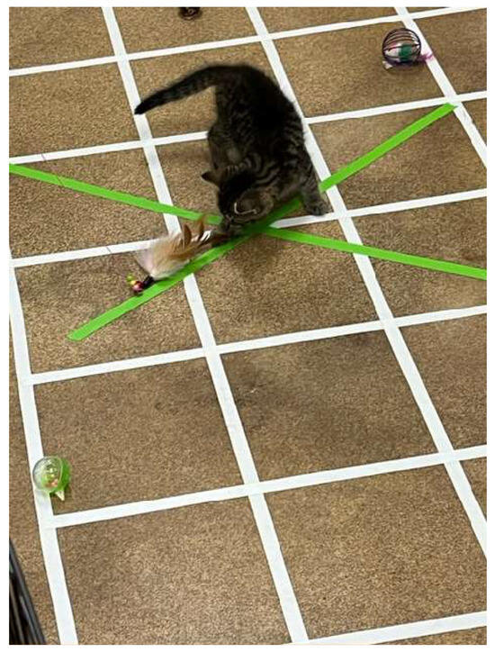 The feather test was the last part of the 5 min open field and interactive object test. After 4 min of exploration of the field and the items within it, the interactive object test was introduced. This portion of the test was conducted by an experimenter located outside the arena. The interactive object here was a long wand toy with feathers and bells. The experimenter, holding the wand toy, inserted the feathered end through the arena wall and moved it in an ‘X’ pattern along a pre-marked course within the arena space (see Figure 2). The experimenter did not directly interact with the kitten during this test. This test was used to assess interaction with a predictably moving object since object play and willingness to explore moving objects—separately from interest in and interaction with humans—may be impaired if maternal care is insufficient [26,32,34,66,91]. This portion of the test lasted for 1 min. Upon completion of the test, the kitten was gently collected by a researcher and placed back into the travel carrier for a 5 min interval (i.e., before commencing the approach to a novel human test).