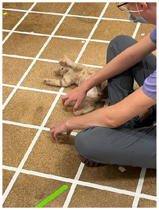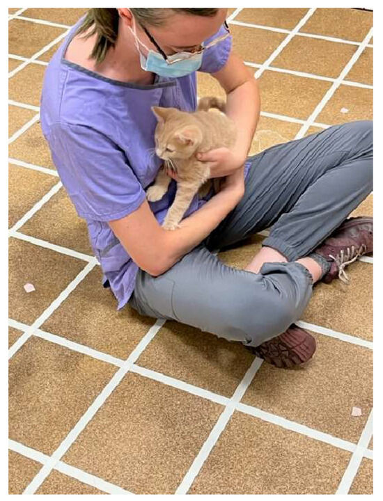 The holding test was adapted from Karsh [41] and Karsh and Turner [3] because these are some of the only published, detailed, experimental data across ages of kittens with respect to human interactions. The total duration of this assessment was 2 min. Here, an experimenter was seated on the ground within the arena, approximately 25 cm from and facing the arena wall. The kitten was removed from the travel carrier and gently handed to the experimenter to be placed in their lap. The experimenter began to softly stroke the kitten from head to tail without any attempt to forcefully restrain the kitten while picking it up fully supported (Figure 4). If/when the kitten left the experimenter, the experimenter would wait until the kitten returned to within “easy reach” proximity (about 12 cm) to pick him/her up for another holding attempt, again ensuring that the kitten was not forcibly restrained in any way. A maximum of 3 holding attempts were permitted for each kitten during a test session. Holding duration for any attempt was measured as the time (s) from when the kitten was settled in the experimenter’s lap, held by their arms, until all four feet touched the ground. After the 2 min had elapsed, the kitten was placed back into the travel carrier, transported to the holding room, and was returned to the kennel with the rest of his/her foster group.