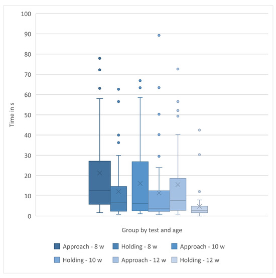 If kittens that did not approach were removed from the holding time data across all weeks (N = 11), the longest holding attempt significantly differed at each of the three ages tested and decreased with age (Friedman test, X2 r = 7.54 (2,39); p = 0.02) (Table 2).