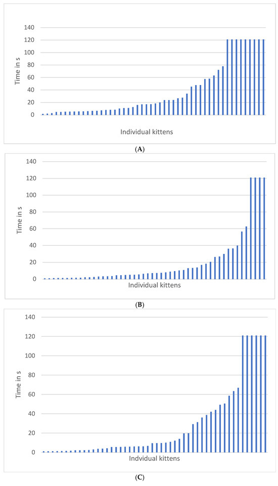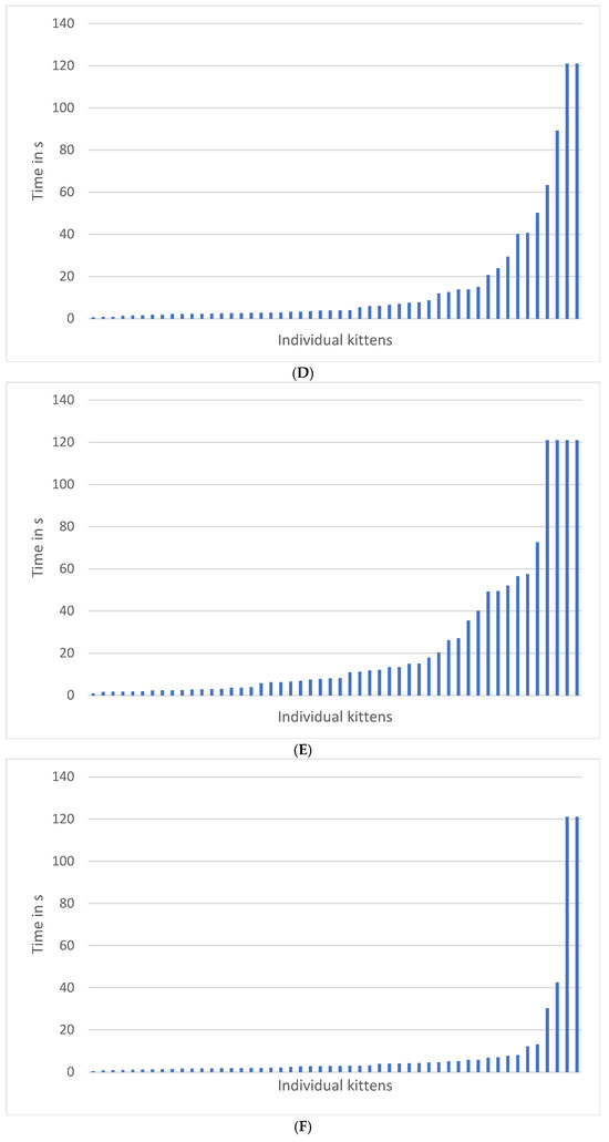 The only data to investigate age-specific effects of types of handling and approaches to humans are those of Karsh [3,40,41,42] who studied well-cared-for laboratory cats. Martinez-Byer et al. [43] investigated handling/struggling, food defence, and separation/confinement responses in 62 9-week-old rescue kittens from varied rearing environments. Marchei et al. [44,45] studied the responses of Norwegian forest cats and Oriental/Siamese/Abyssinian kittens aged 4–10 weeks in their home environments in an open field test and in response to threat when tested in the open field (see summary of results in Table 1).