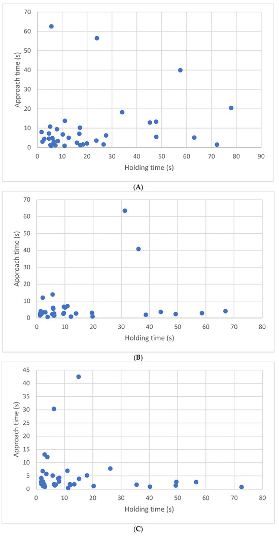 Data for latency to approach and longest time tolerating holding can be found across weeks in Figure 8. To determine whether a predictive relationship existed between approach latency and holding duration, we examined the data of the 39 kittens that approached using Pearson correlations. There were no significant correlations between latency to approach a novel human and holding duration at 8 weeks (r(37) = 0.19, p = 0.27), 10 weeks (r(37) = 0.31, p = 0.24), or 12 weeks (r(37) = −0.12, p = 0.47). Latency to approach a novel human did not predict holding durations (8 weeks, r2 = 0.03 (Figure 8A), 10 weeks, r2 = 0.09 (Figure 8B), 12 weeks, r2 = 0.01 (Figure 8C).
