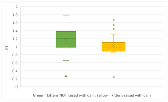 In addition to the 50 kittens discussed above, blood samples were collected from an additional 41 later-season kittens; 32 samples were adequate to measure RTL. These kittens presented at the HS at a range of ages (0–162 days; mean = 76 days; SD = 19.1 days) and consisted of 20 females and 21 males (49% and 51%, respectively). These kittens did not participate in any behavioural testing and no questionnaires were completed for them.