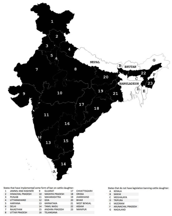 India leads the global bovine population charts with 307 million dairy-purpose bovines, accounting for nearly a third of the world’s cattle [1]. The cows and buffaloes together contribute to 97% of the total milk produced in the nation [2]. A ban on the slaughter of cows exists in the majority of the Indian states (Figure 1), the existence of which is intricately interweaved with the disputable yet publicly acknowledged sentiment of the cow’s sacrality, as well as with the animal’s utility value. Largely governed by India’s legislative and economic systems, the slaughter ban plays an imperative role in the welfare of the dairy-purpose cows and buffaloes by influencing their treatment by the nationals.