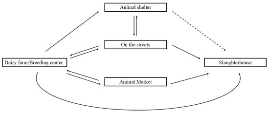 The culturally originated legal binding that prevents dairy farmers from sending the majority of the unproductive cattle for slaughter exerts a significant negative impact, especially on the small-scale dairy farms, which make up the majority of the dairy farms in the nation [16]. Rearing unproductive cattle limits the resources available to provide adequate feed, shelter and veterinary care, compromising the entire herd’s welfare. The strain caused by the inability to slaughter the revered cow, and the economic costs of the animal’s lowered productivity seem to result in the Indian dairy industry resorting to ethically unfit means of dispensing with the animals. The unwanted dairy bovine meets one of the following fates (Figure 2): The bovines, upon serving their economic purpose, are sent to animal shelters, abandoned on the streets, or in the case of the sub-optimally producing animals, sold in animal markets. In the limited states permitting the slaughter of the bovine, the animals may be transported from the farm to the slaughterhouse directly. Bovines abandoned on the streets or sold in markets are eventually transported to a slaughterhouse, either legally or illegally. The transport of cows from shelters to slaughterhouses remained unknown, possibly because of the religious association of several cow shelters in the nation [17,18].