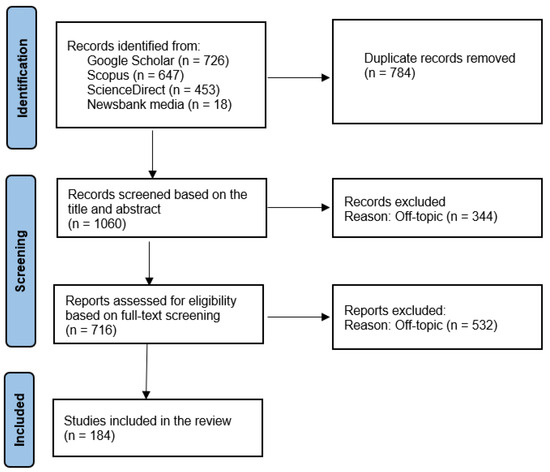 Figure 3 illustrates the procedure performed to select and discard bibliographic sources. In total, 1844 studies were imported for screening, of which 784 were duplicates. From the rest, 344 were deemed irrelevant (did not pertain to the pre-set inclusion criteria) from a title and abstract search, and 532 were excluded following a full text analysis. The following are the results based on the analysis of 184 publications on the welfare of Indian dairy bovines.