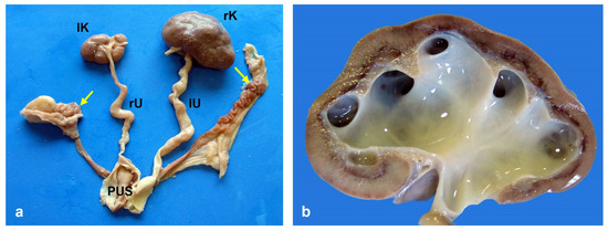 (a) Anatomical preparation of the urogenital system of piglet P79. There is a persistent urogenital sinus (PUS) into which the reproductive tract and both ureters (right, rU, and left, lU) are very dilated (hydroureters). The right kidney (rK) presents hydronephrosis, and the left kidney (lK) is hypoplastic. There is no urinary bladder. The ovaries (arrows) are hypoplastic, as is the entire reproductive tract. (b) Sagittal view of the right kidney. Note the presence of hydronephrosis and the reduced thickness of the renal cortex.