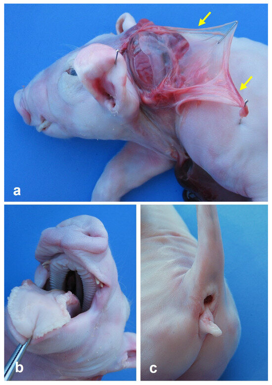 - Martín-Alguacil, N.; Avedillo, L. Body wall defects and amniotic band syndrome in pig (Sus. scrofa domesticus). Anat. Histol. Embryol. 2020, 49, 144–149. [Google Scholar] [CrossRef] [PubMed]
