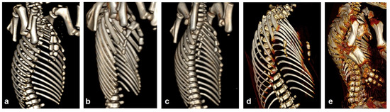Right ventrolateral view of thoracic cavity skeleton on 3D-VR CT reconstructions showing the sternums of five of the piglets studied. (a) Piglet 382 with a normal sternum was used as a control. (b) Piglet 395, bifid sternum. (c) Piglet 390, complete sternoschisis. (d) Piglet 380, complete sternoschisis with agenesis of caudal sternites. (e) Piglet 353, sternal hypoplasia.