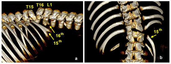 3D-VR CT reconstructions of piglet P285. (a) Right lateral and (b) dorsal view of the spine. Note the right 14th rib was rotated and hypoplasic and the left 15th rib was bifid.