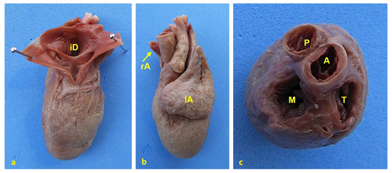 (a) Caudal view of the heart of piglet 401, after sectioning of the venae cavae. Note the large interatrial defect (iD). (b) Cranial view of the same heart showing the large left atrial (lA) hyperplasia and right atrial (rA) hypoplasia. (c) Dorsal view of the cardiac base of the same heart; note the tricuspid valve (T) stenosis. A, aorta; M, mitral valve; P, pulmonary trunk.