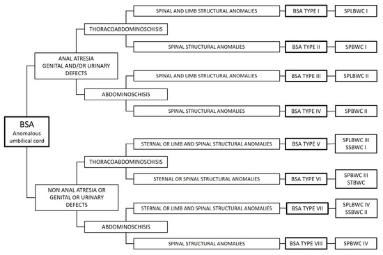 Body stalk anomalies classification: BSA, body stalk anomalies; SPBWC, spinal-body wall complex; SPLBWC, spinal-limb and body wall complex; SSBWC, sternal-spinal-body wall complex; STBWC, sternal-body wall complex.