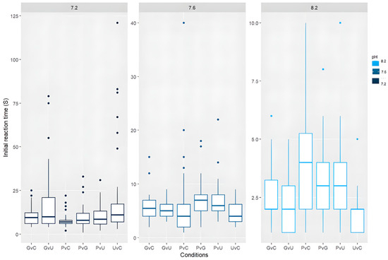 Initial reaction times (s) of C. maenas in each experimental condition under three different pH levels: 8.2, 7.6, and 7.2; n = 40 per condition. The pH is stated at the top of the figures. The reaction times are much larger in pH 7.2—most prominent in PE vs. glutathione and PE vs. control conditions. Conditions are GvC (glutathione vs. control), GvU (glutathione vs. UTP/UDP), PvC (PE vs. control), PvG (PE vs. glutathione), PvU (PE vs. UTP + UDP), and UvC (UTP + UDP vs. control). Notice the different scales in the y axis.