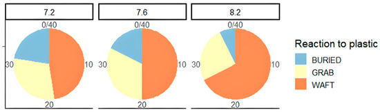 The hypothesis that the combined effects of OA and microplastic odour as stressors result in greater impacts on olfactory detection in C. maenas was confirmed in several of the experimental conditions, particularly the PE vs. GSH (food) and PE vs. control tests, where initial reaction times were significantly slower at pH 7.2 compared to pH 7.6 and 8.2.