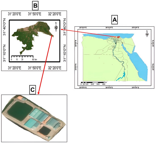 The study area at El-Ekhlas hatchery, located in Damietta Governorate near the Mediterranean Sea. (A) Map of Egypt, (B) Damietta Governorate, and (C) El-Ekhlas hatchery. Maps were generated using ArcGIS 10.8 software (Environmental Systems Research Institute, Redlands, CA, USA).