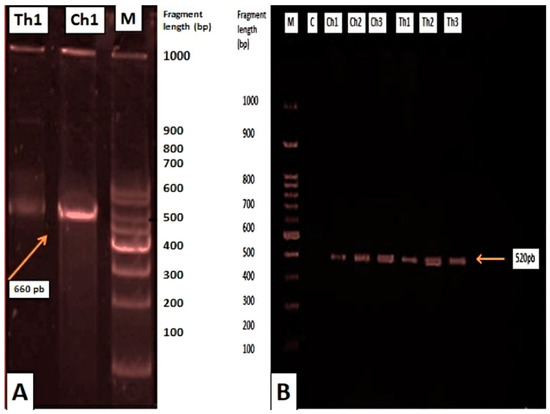 Specific genomic amplification products. (A) PCR product for the rbcL gene (~660 bp) of Chaetoceros calcitrans (Ch1) and Thalassiosira weissflogii (Th1), with the molecular size standard (M). (B) PCR product for the ITS region.