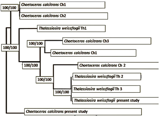 Phylogenetic analysis based on rbcL and ITS-2 genes showing well-clustered clades of Chaetoceros and Thalassiosira, grouped within the Bacillariales clade. Bootstrap values (100/100) at the nodes represent strong support from Maximum Likelihood (ML) and Bayesian Inference (BI) analyses, respectively.